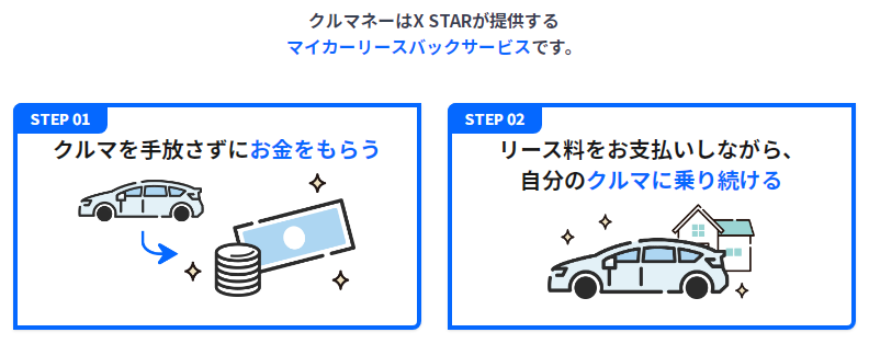 カーリースバックに興味がある方には、X STAR株式会社の「クルマネー」がおすすめです。クルマネーはスマホで簡単に申し込めるマイカーリースバックサービスで、最短で即日入金にも対応しています。